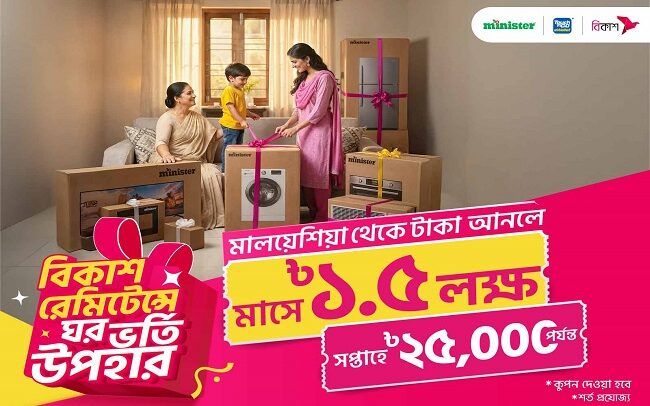 সিনিউজ ডেস্ক: মালয়েশিয়া থেকে আন্তর্জাতিক মানি ট্রান্সফার প্রতিষ্ঠান ‘টাচ এন গো’ এর মাধ্যমে বিকাশ-এ পাঠানো সর্বোচ্চ রেমিটেন্স গ্রহণকারী একজন প্রবাসীর স্বজন প্রতি মাসে পেতে পারেন ১৫০,০০০ টাকার মিনিস্টার পণ্যের কুপন। পাশাপাশি, প্রতি সপ্তাহে আরও পাঁচজন করে পাচ্ছেন ২৫ থেকে ৫ হাজার টাকার কুপন।