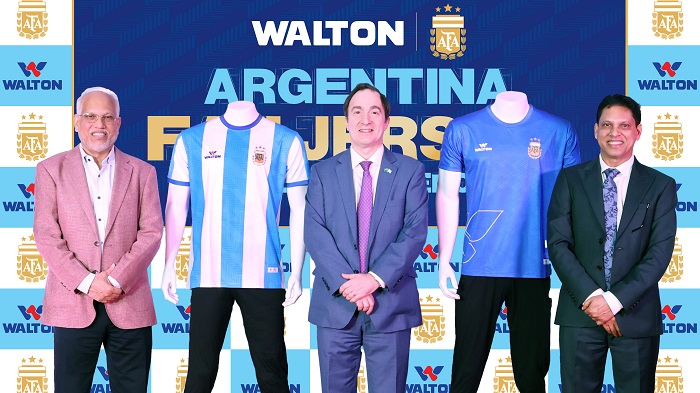 সোমবার (২৩ ফেব্রুয়ারি, ২০২৬) রাজধানীর ওয়ালটন কর্পোরেট অফিসে আয়োজিত অনুষ্ঠানে ‘আর্জেন্টিনা ফ্যান জার্সি উন্মোচন’ করা হয়। অনুষ্ঠানে প্রধান অতিথি ছিলেন ঢাকায় নিযুক্ত আর্জেন্টিনার রাষ্ট্রদূত মার্সেলো কার্লোস সেসা। অন্যদের মধ্যে আরো উপস্থিত ছিলেন ওয়ালটন হাই-টেক ইন্ডাস্ট্রিজ পিএলসি’র চেয়ারম্যান এস এম শামছুল আলম, ম্যানেজিং ডিরেক্টর এস এম মাহবুবুল আলম এবং পরিচালক সাবিহা জারিন অরনা।